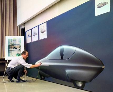 5 The GM Runabout had a front wheel that could turn 180 degrees to allow parking in the tightest of spots. Original concept drawing board.